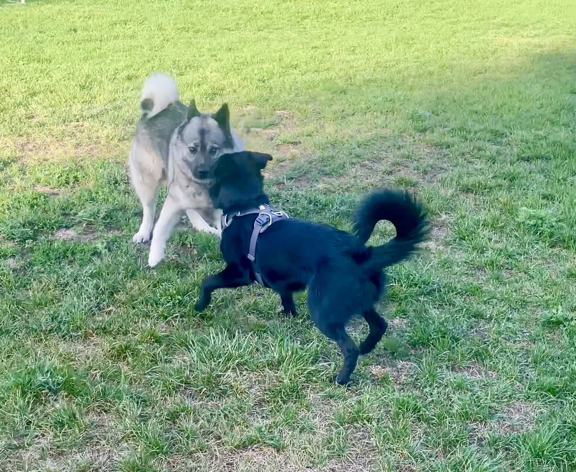 The black dog was quite dog-reactive and scared, and she learned that playing with other dogs was pretty fun!